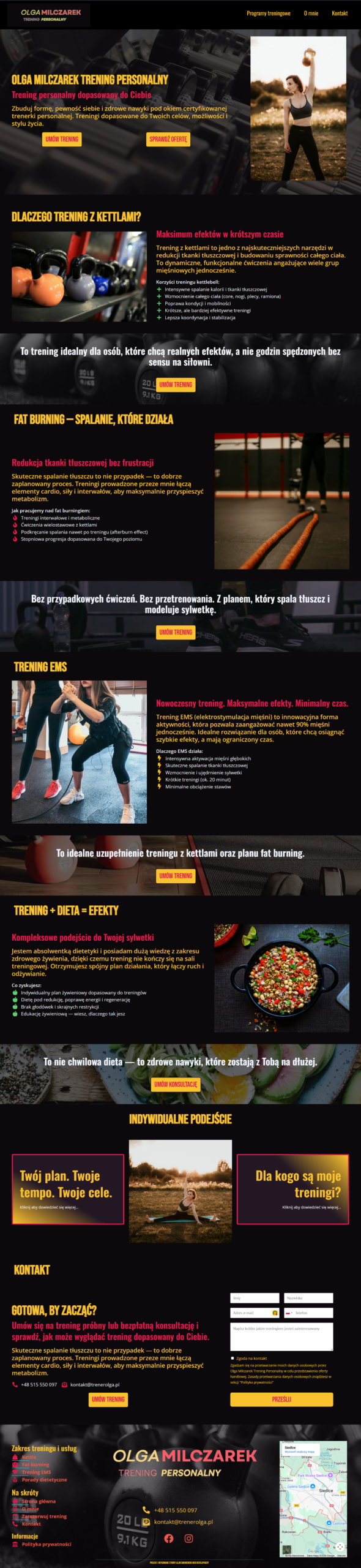 Strona internetowa trenerki personalnej Olgi Milczarek, która ułatwia kontakt i w czytelny sposób prezentuje ofertę.